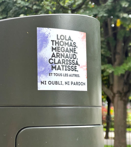 "Lola, Thomas, Mégane, Arnaud, Clarissa, Matisse et tous les autres, ni oubli, ni pardon "- Stickers autocollants